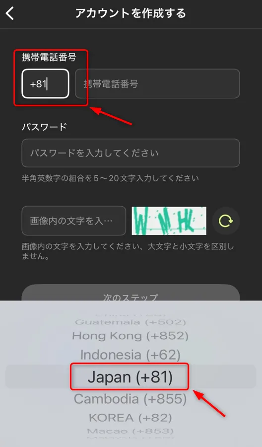 日本の携帯電話番号の場合は、JAPAN(+81)を選択してください。