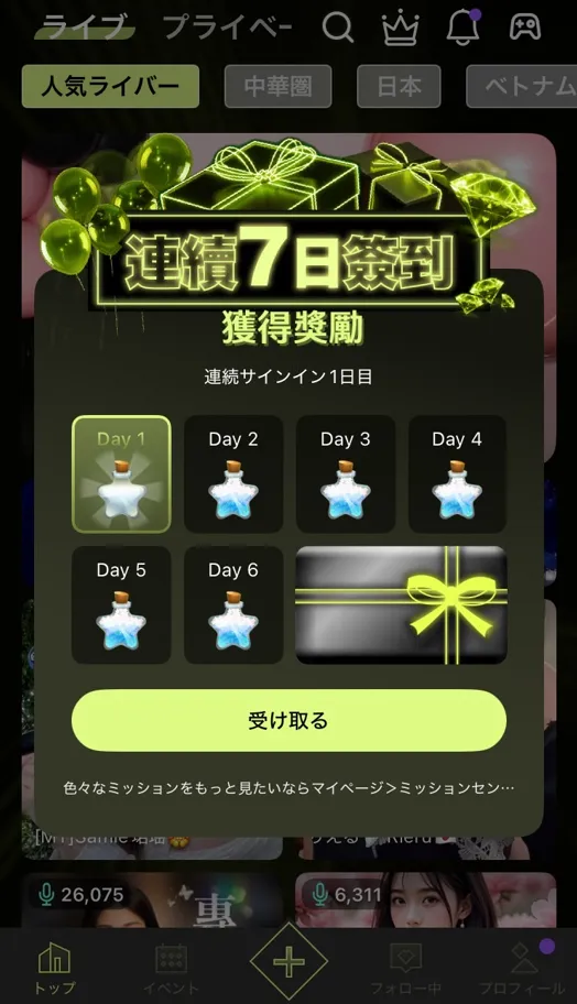 正常にログインできると画面が切り替わり、ログインボーナスを受け取れます。